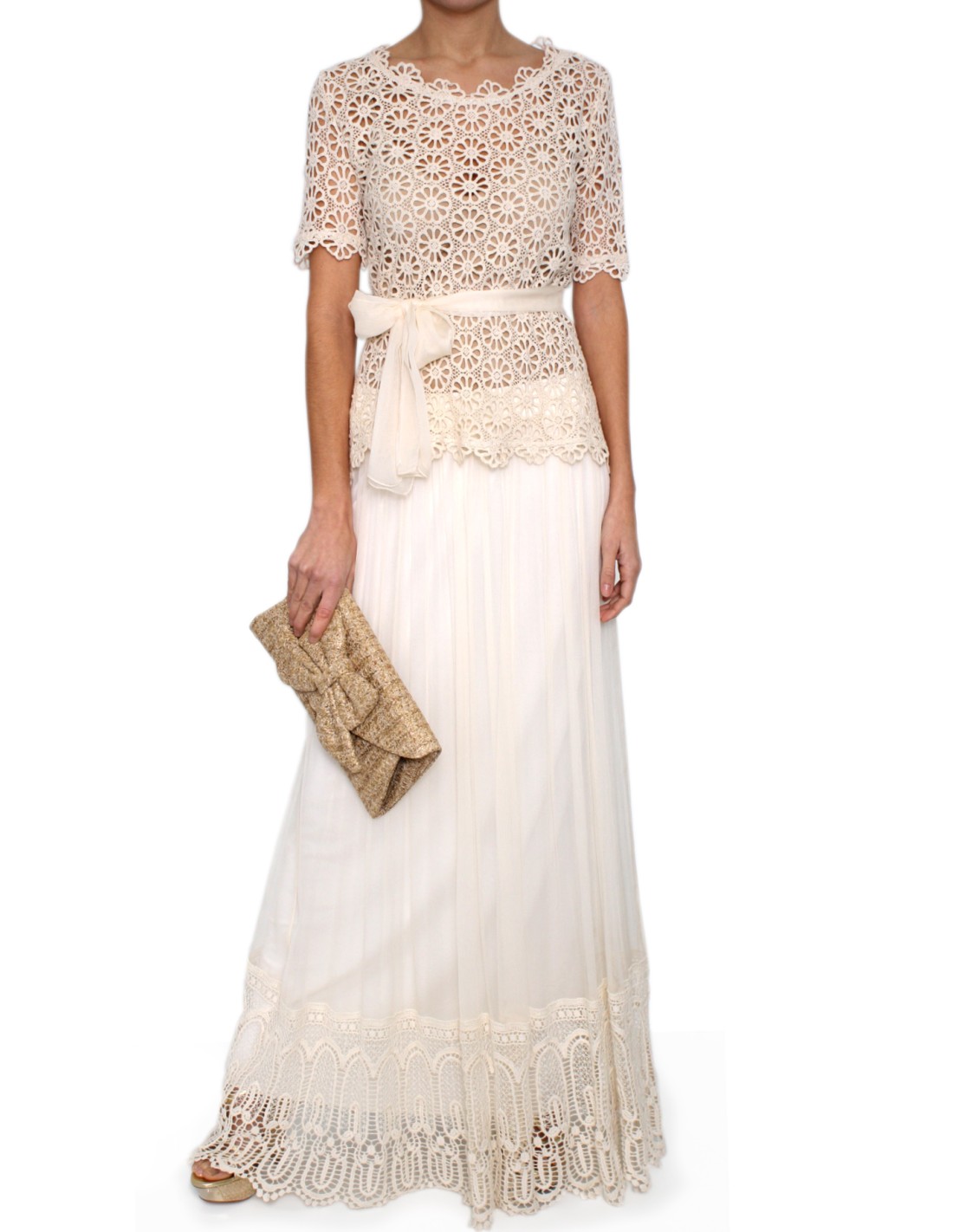 Falda larga realizada en bambula de seda color crudo, con bajo de crochet a tono y lazada de gasa en cintura.